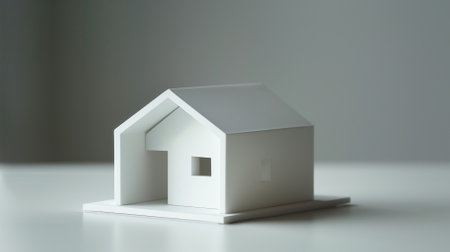 Modern house on wood tower block game white wall background copy space. Mortgage loan for buying home or real estate property, money risk management in financial, foreclosure and bankruptcy concept.
