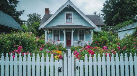 A picturesque country-style two-story home with white picket fence, gabled roof, and a flower-filled garden.