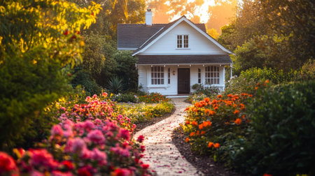 Charming white country house with a flower-filled yard, water drops on vibrant petals, warm lighting generative ai