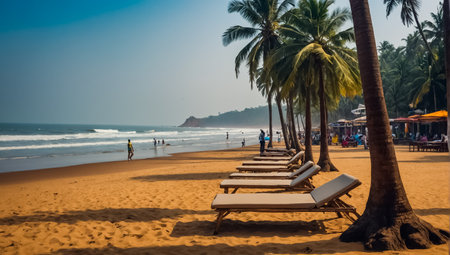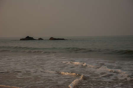 Sandy tropical beach, Arabian Sea, Indian Ocean. Resort Goa, India, beach Arambol. Lifestyle Travel, outdoor activities in nature.