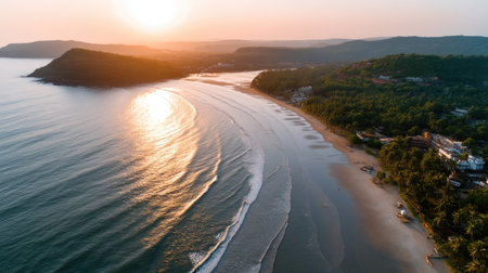 This stunning aerial view captures a peaceful tropical beach at sunrise, showcasing gentle waves lapping the shore and lush hills in the background.