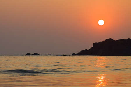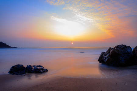 A colorful sunset or sunrise on the seaside with a sandy beach with impurities of volcanic ash. Mandrem, Goa, India. Beautiful seascape.