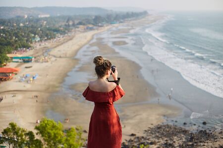 Young girl takes pictures of landscapes on the camera. The Girl photographs the sunset on the camera.