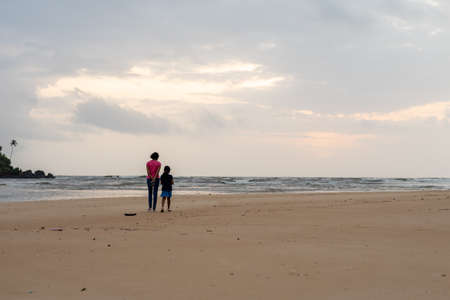 Mother and daughter walking on the beach at sunset in Sri Lanka.