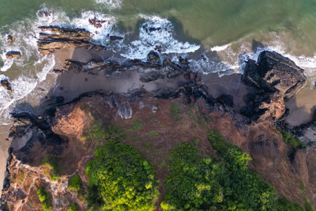 Foam waves striking the rocky shore of Varkala Beach in top view