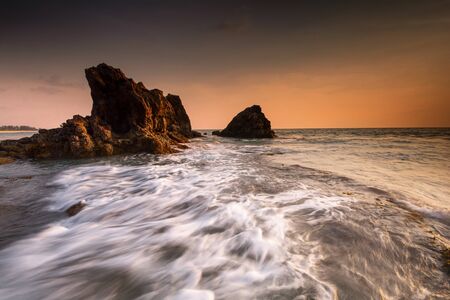 Colorful tranquil tropical sunset over a rocky coastline in Thailand with a long exposure view of a glowing a pink to orange sky and calm ocean