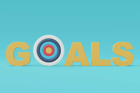 Goals word written on wood block. Goals word is made of wooden building blocks lying on the blue table. Business concept, yellow background