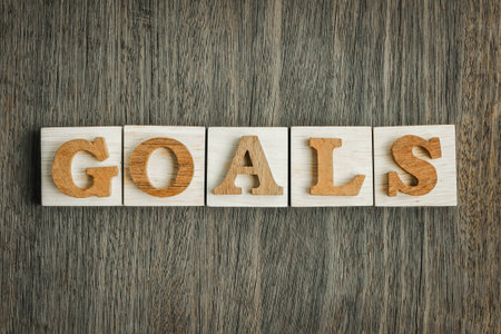 the word GOALS is written on a wooden cubes structure. blocks on a bright white background.