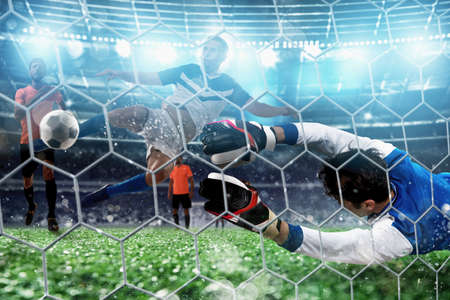Goalkeeper catches the ball. Football player kicking a ball into the net at a football match. Generative AI illustration