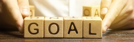 Businessman puts wooden blocks with the word Goal. The concept of achieving business goals. Reaching new heights. Execution of a business plan. Purposefulness. Perseverance. Target. Planning