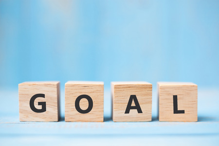 A wooden block with the word goal written on it is placed on a blue background with a red circle