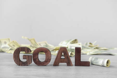Concept words GOAL on wooden blocks on beautiful background from dollar bills. Business concept.
