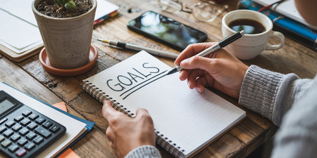 woman hand writing goals in notebook with coffee cup on wooden table.