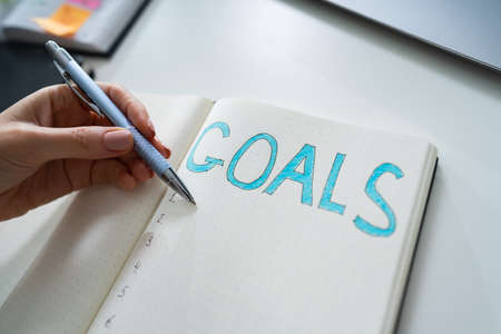 High Angle View Of A Businessperson's Hand Writing Goal Concept On Notebook