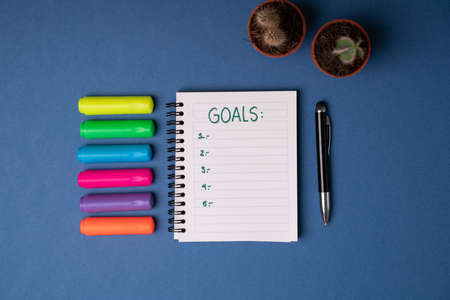 Minimalist office workspace with a notebook, pen and markers. List of goals on a notepad next to cactus plants