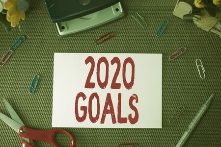 Handwriting text 2020 Goals. Conceptual photo A plan to do for something new and better for the coming year Scissors and writing equipments plus plain sheet above textured backdrop