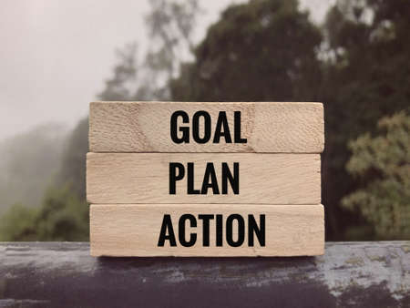 Motivational and inspirational words - Goal, Plan, Action written on wooden blocks.