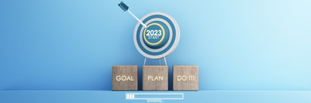 Countdown start new year 2023 with the vision and perspective of planning to achieve goals. concept for the future business and management. in cartoon illustration on pastel background. 3d rendering