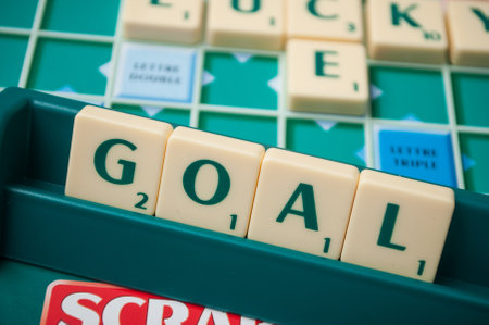 Mulhouse - France - 4 October 2019 - Closeup of plastic letters forming the word goal on Scrabble board game