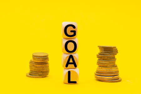 Goal on wooden cubes and stcack of coins. Target in business concept