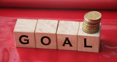 Goal on wooden cubes and stcack of coins on red. Target in business and career concept.