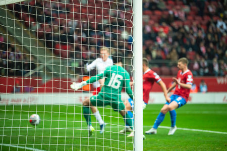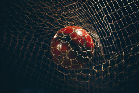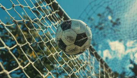 Soccer ball expertly kicked into the back of the net during an exciting and intense match