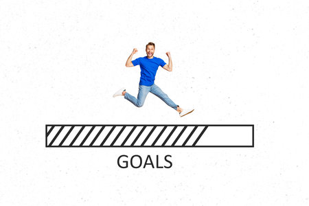 Composite collage trend artwork template design of charts analyzing business goal bar loading graphics young man run excited development