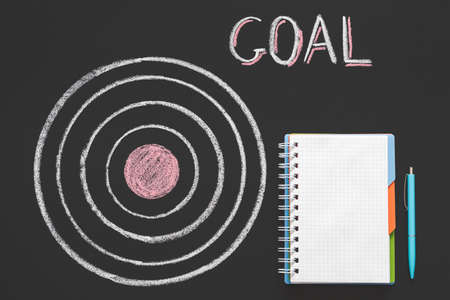 Inspiration and brainstorming. Develop strategy to reach goal. Future success. Target drawn in chalk, notepad and pen.