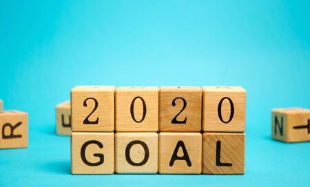 Wooden blocks with the inscription 2020 goal. The concept of achieving business goals. Execution of a business plan. Purposefulness. Planning. Strategy and management