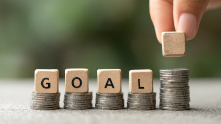 A focused image of coins stacked high with letter blocks spelling GOAL, symbolizing the journey of achieving financial success and personal growth.