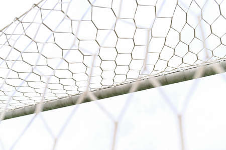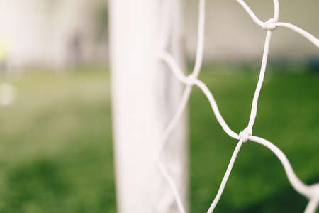 Football backgeound. Soccer football equipment. White soccer net on a goal. Soccer net nodes. Blurred goalpost in the background