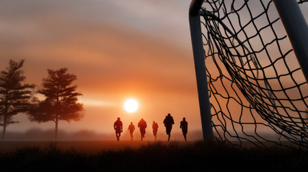 A stunning silhouette of soccer players running towards a goalpost at sunset, set against a vibrant orange sky, creating a dramatic and inspiring scene.
