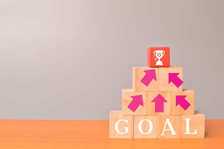 Target and goals concept. Phrase GOALS on wooden blocks with arrow and trophy icons