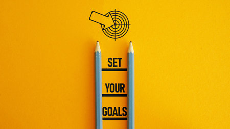 Image with goal setting text on a notepad with pen, plant, calculator and sticky note background. Business concept