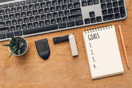 Business concept New year Goals, Hardware Wallet for crypto currency and keyboard on wood table with note