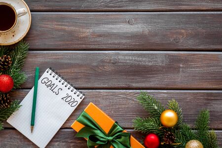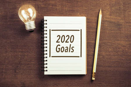 Business concept of top view 2020 goals list with notebook over wooden desk