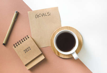 Business concept of top view 2022 goals and cup of coffee over wooden desk.