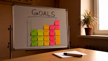 Whiteboard with GOALS header and vertical progress bars made of green/yellow/red sticky notes, marker pen beside it, office environment