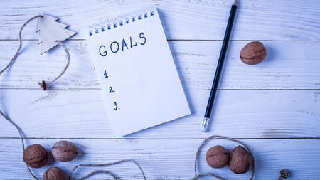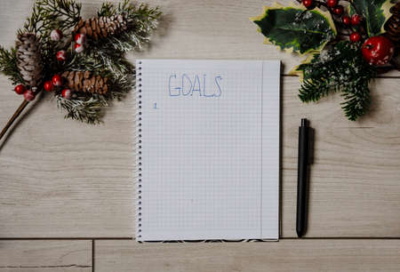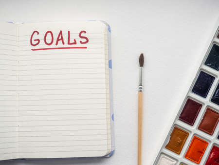 Goals in notepad lettering with red paints. Place for your text. The concept of goals in painting. Case planning. Happy New Year, Merry Christmas. Education motivation,inspiration. Top view, flat lay