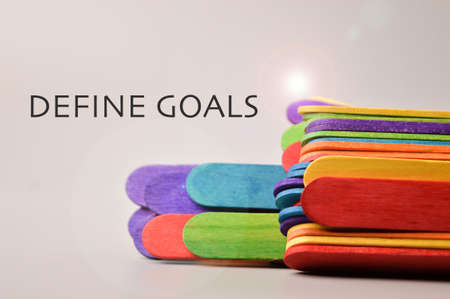Set Goals, motivational words in wood alphabet letters isolated on multi coloured background as banner headline