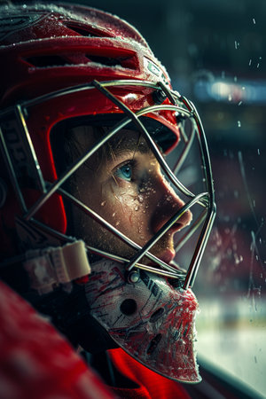 A striking close-up of a young male hockey goalie wearing a protective mask, showcasing intense focus and determination as he prepares for a competitive game on the ice.