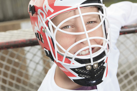 A young teen hockey goaler outside in the arena