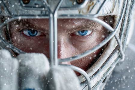 A determined goalkeeper with piercing blue eyes stands vigilant behind his mask, as snowflakes drift down in a fierce winter match environment.