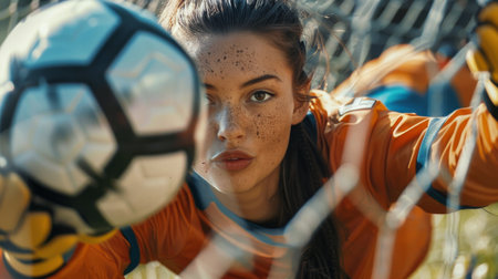 Focused goalkeeper stretches to block incoming ball with skill and determination during critical tournament play. Concept of professional sport, culture, challenge, tournament, action.