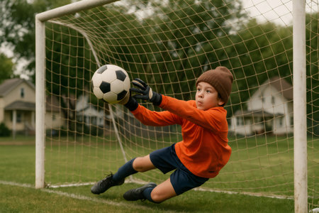 Kid being goal keeper in a soccer game.