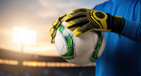 Close up of a professional soccer goalkeeper wearing black and yellow gloves, holding a white and green football in a stadium at sunset. The focus is on the ball and hands.