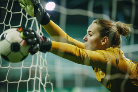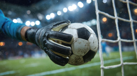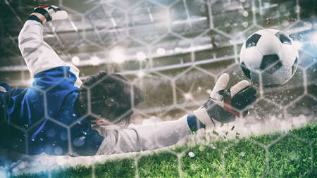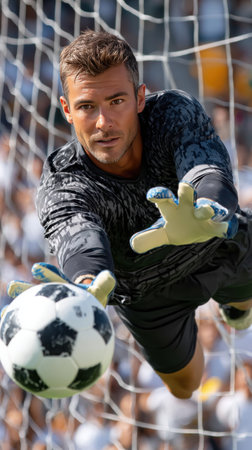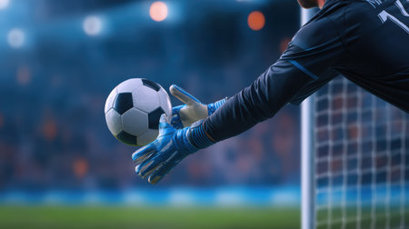 Athletic goalkeeper is diving to catch soccer ball during match, demonstrating skill and focus in a vibrant stadium filled with cheering fans and bright lights