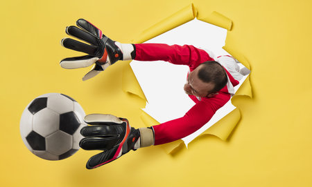 Goalkeeper exits from a hole and tries to tatches the ball. yellow background