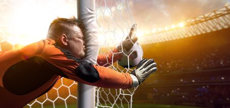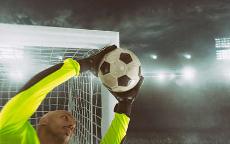 Goalkeeper catches the ball at the stadium. The concept of a healthy lifestyle.