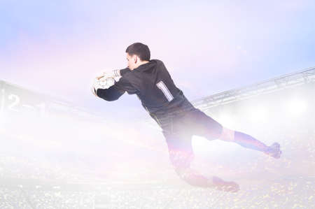 double exposure photo of stadium and soccer or football goalkeeper is catching ball